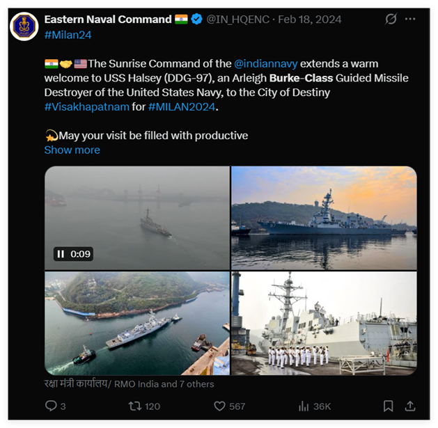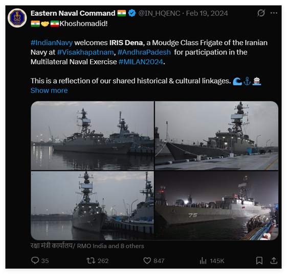 印度海军的官方账号还于今年2月活动期间,公开发帖对伊朗这艘军舰的到来表示热烈欢迎。