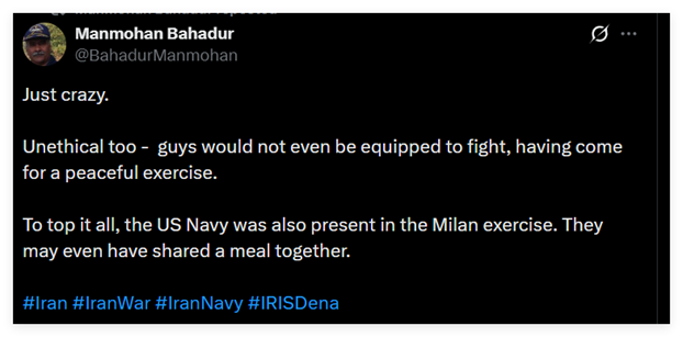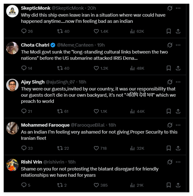 因此,当伊朗“德纳”号完成了在印度的活动,在返航途中遭到美军击沉后,不少印度网民都对美军杀害自己国家客人的做法感到愤怒,对印度没有保护好伊朗客人感到自责和内疚。这些帖文都获得了大量点赞。