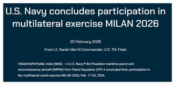 对此,耿直哥检索发现,在今年以及2024年这两次有伊朗“德纳”号参加的“米兰”演习中,美军确实都有派人参加。从美国海军和印度海军发布的相关消息来看,今年美军派往印度参加活动的是一架P-8A反潜巡逻机,2024年时则是“哈尔西”号导弹驱逐舰。