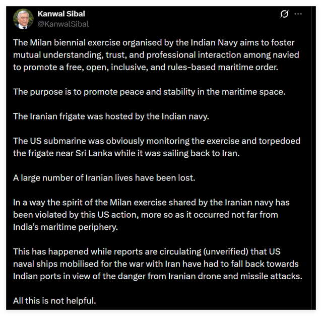 印度前外交秘书、资深外交官坎瓦尔・西巴尔在一则帖文中强调了印度“米兰”联合演习的意义,称这一活动的目的,是增进各国海军间的相互理解、信任与专业交流,演习目的是维护海洋空间的和平与稳定。他还认为,伊朗海军是秉持着这场军演的精神返航的。